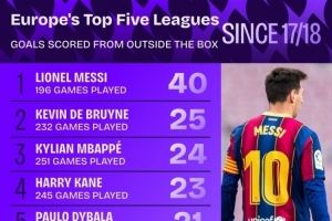 17-18赛季以来五大联赛禁区外进球:梅西40球最多,丁丁25球次席